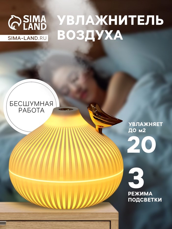 - Компактный и стильный дизайн: Белый корпус, деталь в виде птички и небольшие размеры позволяют устройству органично вписаться в любой интерьер. Увлажнитель легко разместить на столе или тумбочке.